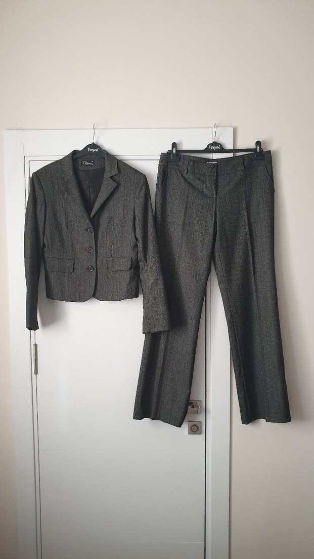 1 defa giyildi .yenidir.kumaşı güzel kırışmıyor. düğmeli ceket ve düz paça pantolondan oluşan ofis takımı.44 ama kalip dar ölçüleri dikkate alin