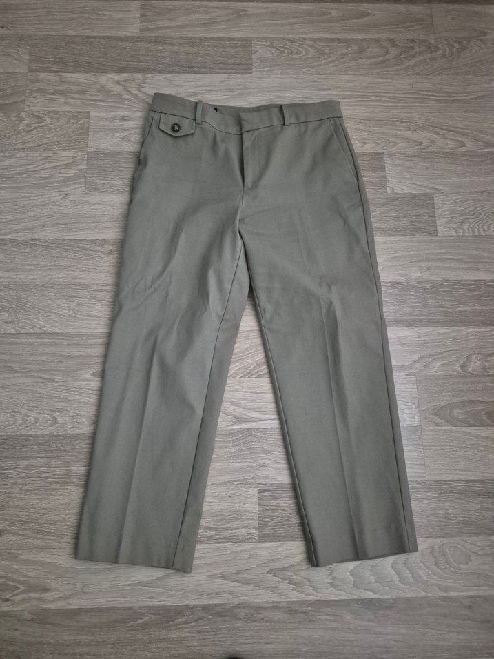 Gri renkte, kemerli ve normal boyda kadın kumaş pantolon. Ofis için uygun, normcore tarzında, sentetik kumaştan üretilmiştir.