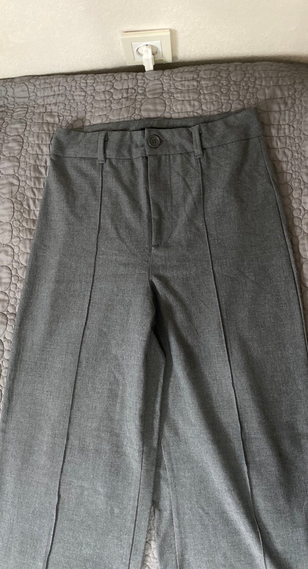 Gri kumaştan üretilmiş, düğmeli ve normal boyda kadın pantolonu. Düzenli kesimi ve desensiz yapısıyla ofis kullanımı için uygundur.
