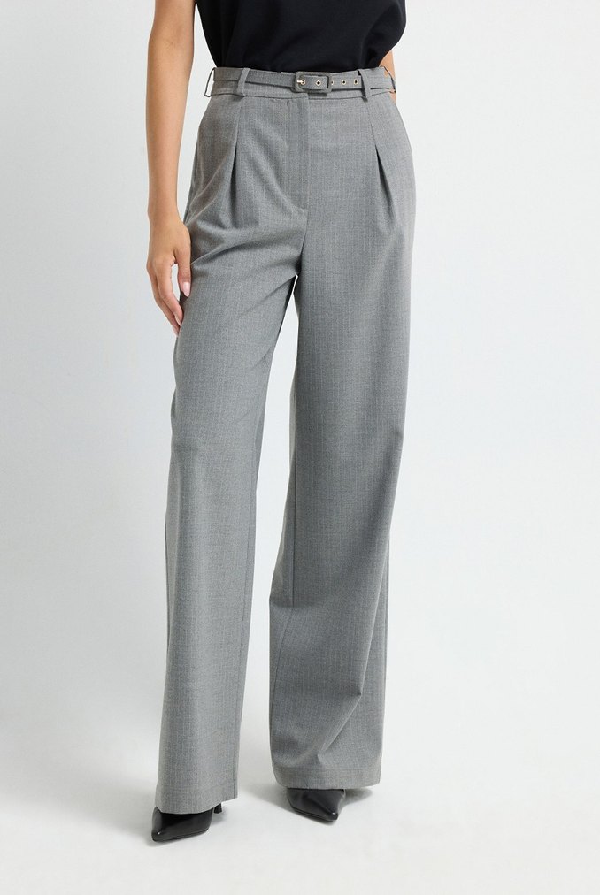 Gri renk, kemerli ve midi boy kadın kumaş pantolon. Sentetik kumaştan üretilmiş, düzenli kesim ve desen içermeyen şık bir modeldir.