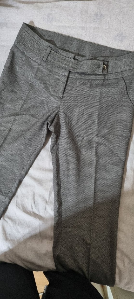 Gri renkte, kemerli ve normal boyda kadın kumaş pantolon. Düz dokusu ve rahat kesimiyle ofis kullanımı için uygundur. orta bel boyu 95 cm beli 41 cm