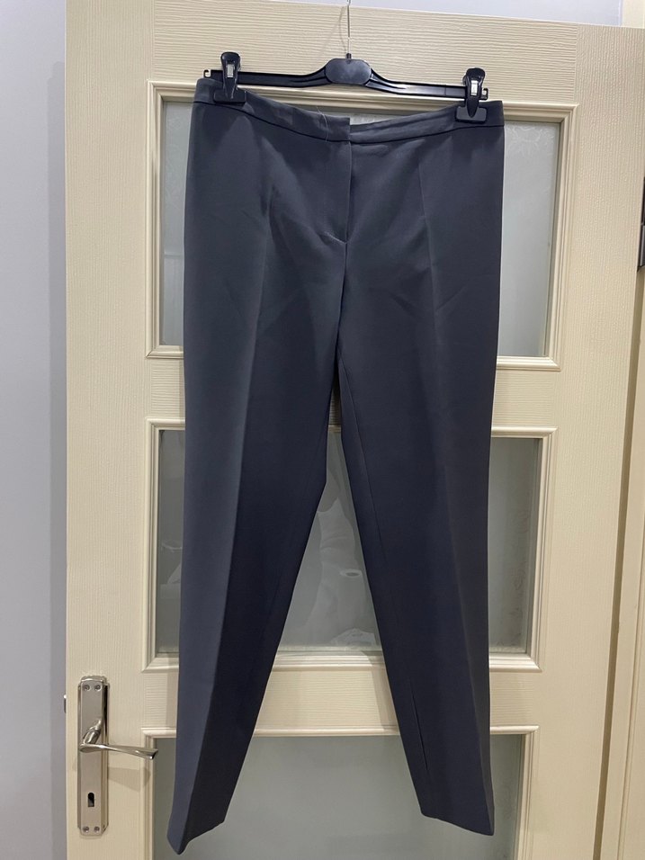 Gri renkli, kemerli, normal boyda kadın kumaş pantolon. Düz kesimli ve ofis kullanımı için uygun, sentetik dokusu yumuşaktır.