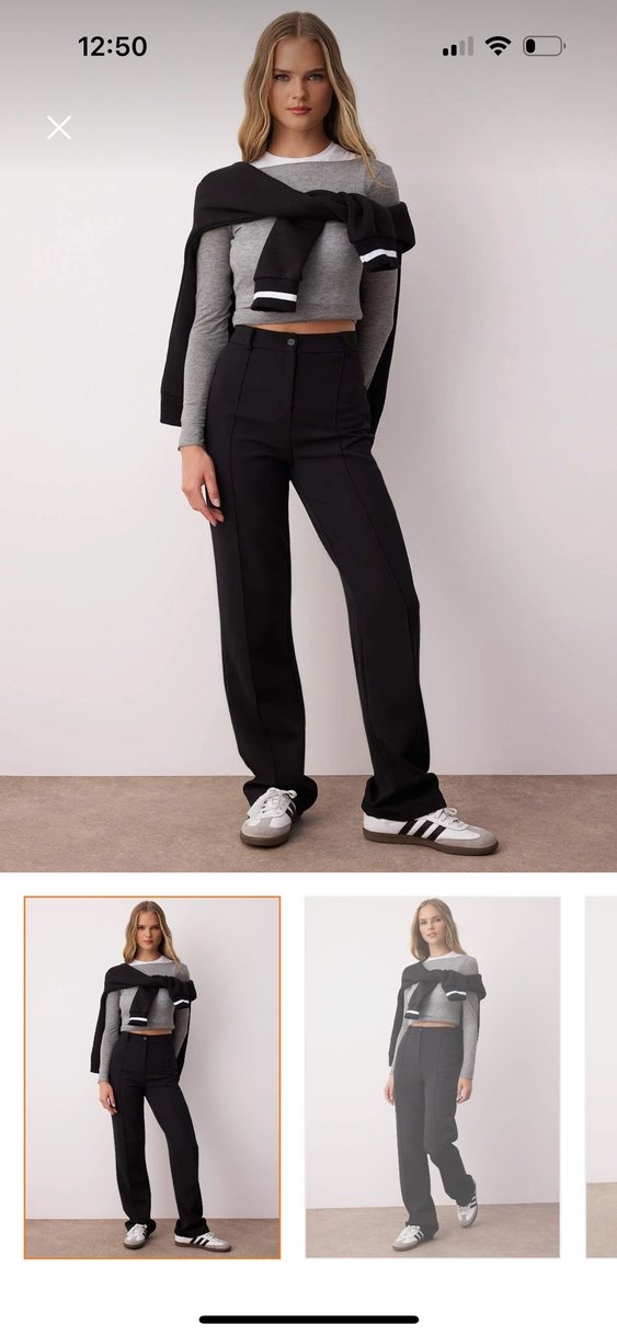 Yumuşak sentetik kumaştan, midi boy, gri kadın kumaş pantolon. Ofis için rahat ve şık, normal kesimle trendy casual tarz sunar.