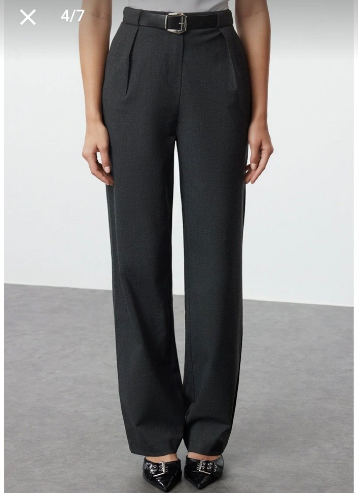 Ofis için uygun, rahat kesim gri kadın kumaş pantolon. Yumuşak sentetik kumaştan, şık ve rahat midi boyda.