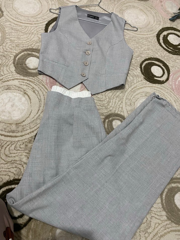 Gri, düğmeli yelek ile kombinlenmiş, regular fit ve normal boy kadın kumaş pantolon. Düz desensiz, sentetik kumaştan, ofis ve trend sokak stili için uygun.