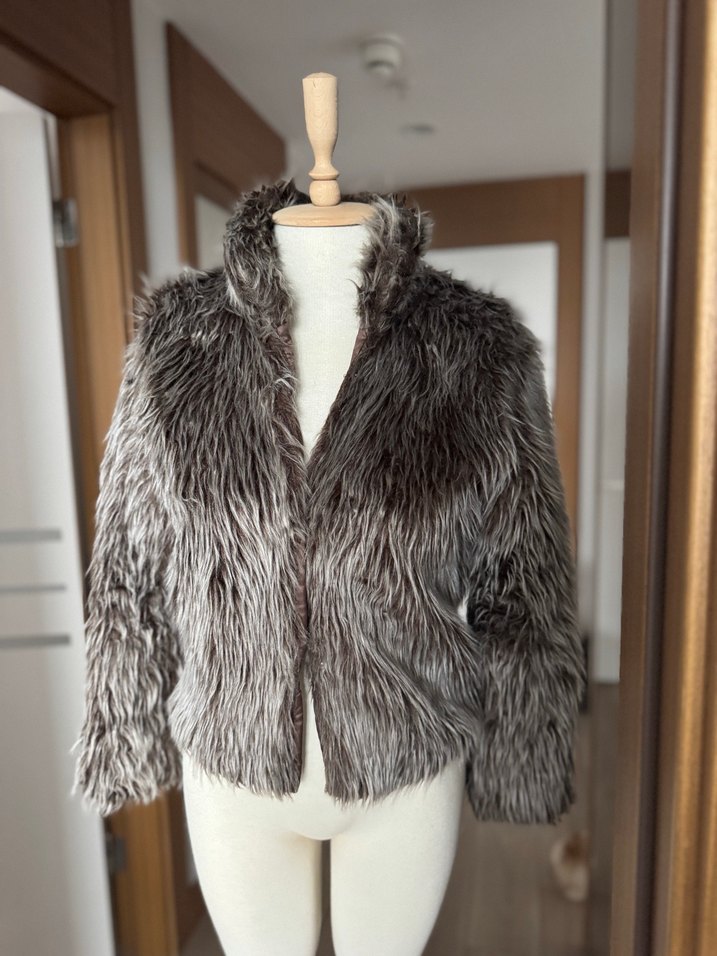 Gri-kahve renkli, uzun kollu ve straplez yakalı, bol kesim suni kürk ceket. Yumuşak sentetik kumaştan, günlük kullanıma uygun rahat ve bohem tarzda.