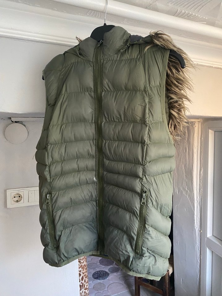 Kolsuz, vücuda oturan gri yelek, yüksek yakalı ve kürklü kapüşonlu. Fermuarlı cepleri ve normal midi uzunluğu ile rahat sokak stili için uygun.