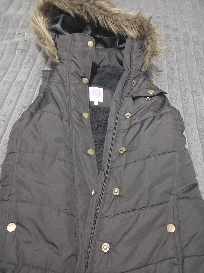 Kürklü kapüşonlu ve kolsuz gri kış ceketi, yumuşak fleece kumaştan, günlük kullanıma uygun rahat ve dar kesim.