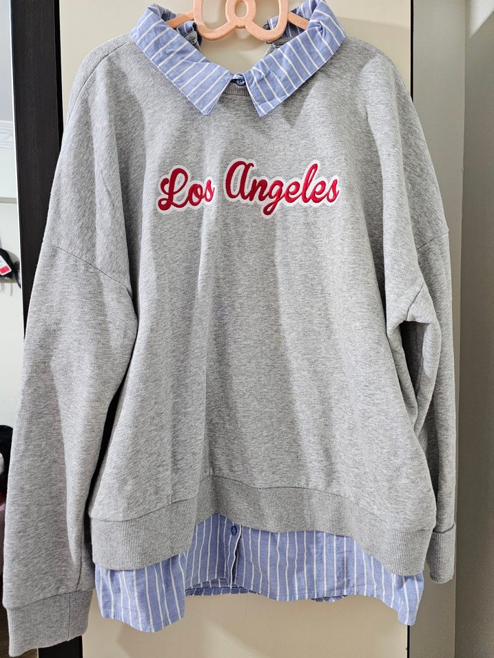 Gri, uzun kollu, rahat kesim, 'Los Angeles' baskılı sweatshirt. Örgü dokulu, mavi çizgili gömlek görünümlü katmanlı detaylı, sentetik kumaştan.