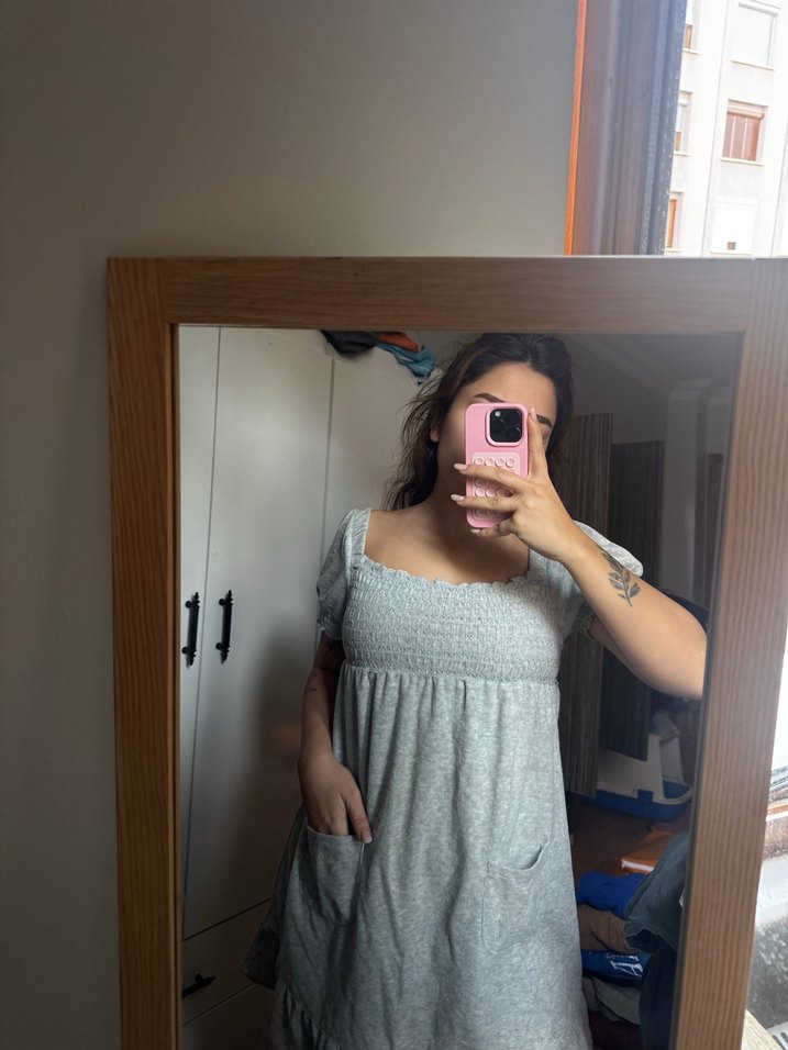 Gri renkli, kısa kollu ve askısız yaka detaylı bol kesim midi tunik elbise