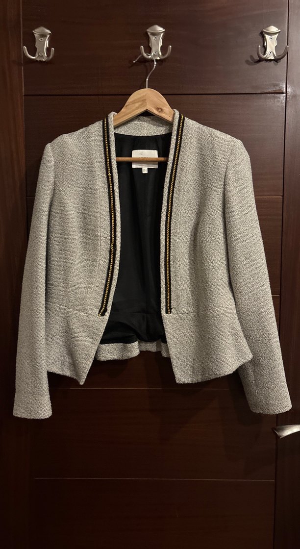 Gri midi blazer, kesme yakalı ve uzun kollu. Rahat kesimi, fermuarlı önü ve yumuşak sentetik kumaşıyla ofis için uygun. ✨