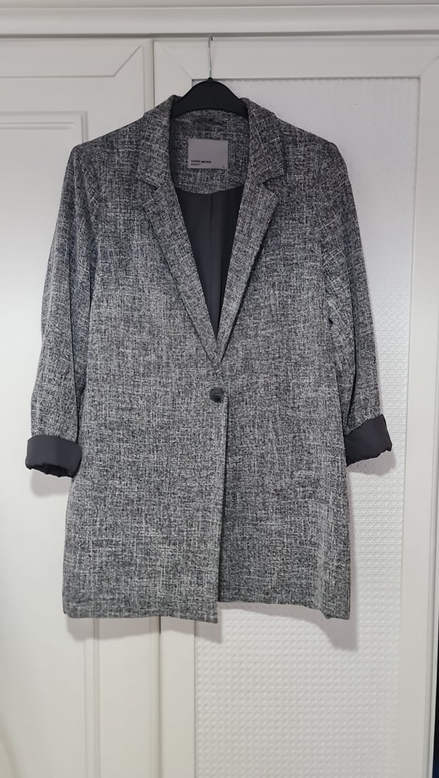 Kadınlar için keten midi blazer ceket, düğmeli ve kesimli yaka detaylıdır. Gri renkte, kıvrık kollu ve normal boydadır, ofis için uygundur.