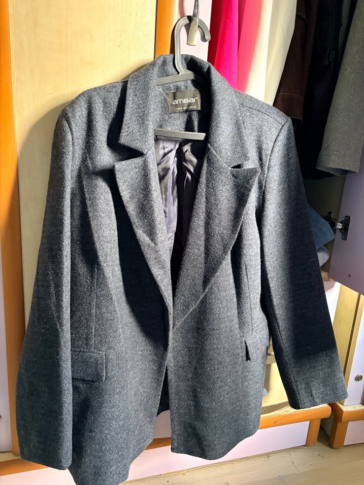 Gri renk, yün kumaştan yapılmış midi boy blazer. Düğmeli, uzun kollu ve normal kesimdir. Ofis ve günlük kullanıma uygundur.