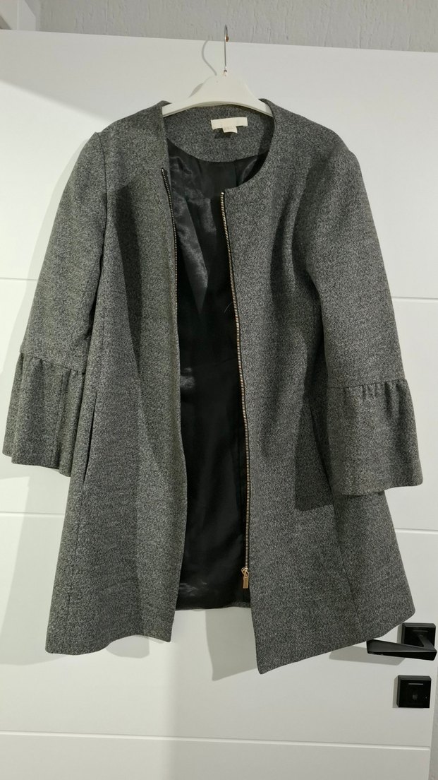 Gri renkli, uzun kollu ve volanlı manşetlere sahip kadın midi boy kaban. Düğmeli, normal kesim ve sentetik kumaştan üretilmiştir. Ofis kullanımı için uygundur.