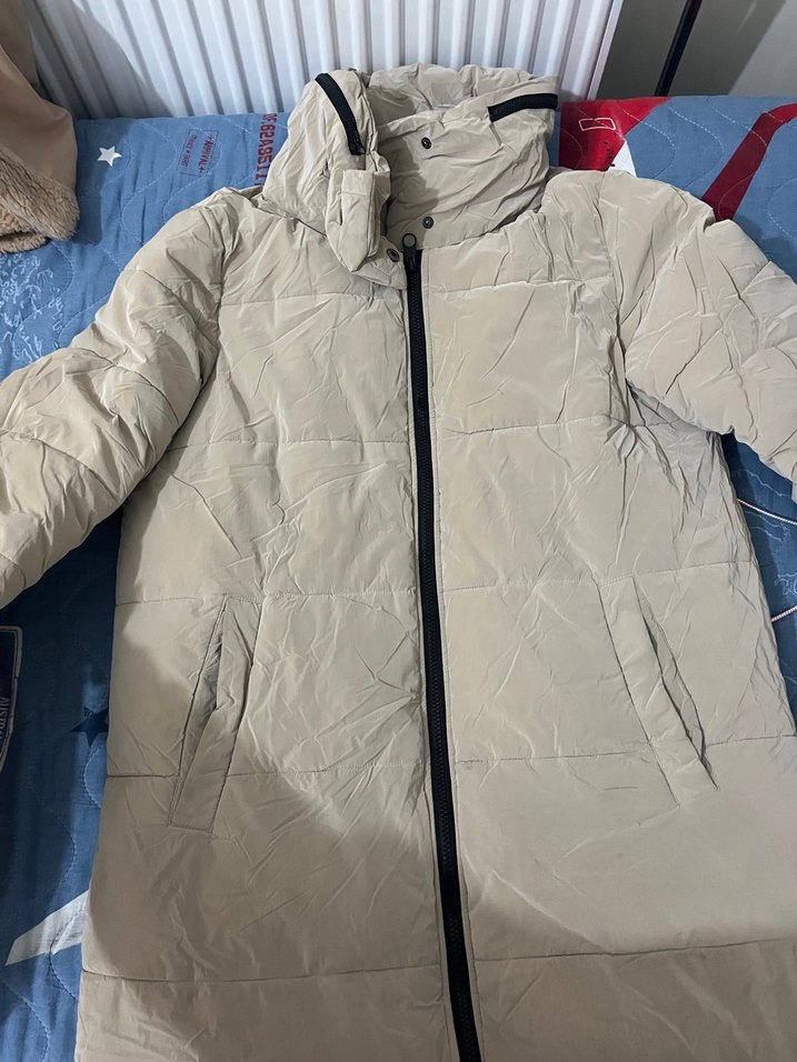 Gri renkli, sentetik kumaştan yapılmış, fermuarlı ve uzun kollu kadın kışlık mont. Midi boyda, notched lapel yakalı, rahat ve şık sokak stili tasarım.