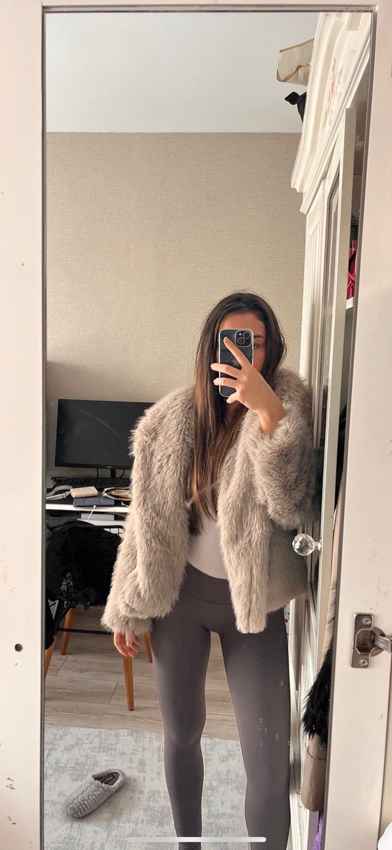 Gri renkli, midi boy, kürk detaylı ve uzun kollu, yumuşak fleece kumaştan üretilmiş, günlük kullanıma uygun kadın kürk yeni alındı marka temsili premium model yumuşacık