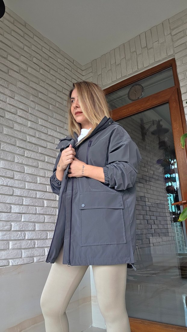 Gri Kadın Midi Boy Rahat Kesim Yağmurluk
