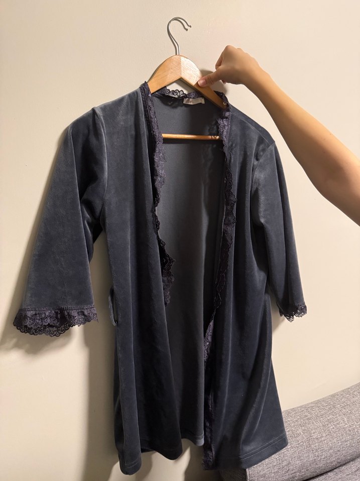 Gri renkte, uzun kollu ve salaş kesime sahip midi boy kadın sabahlık. Yumuşak kumaş ve dantel detaylarıyla rahat bir goth tarzı sunar.