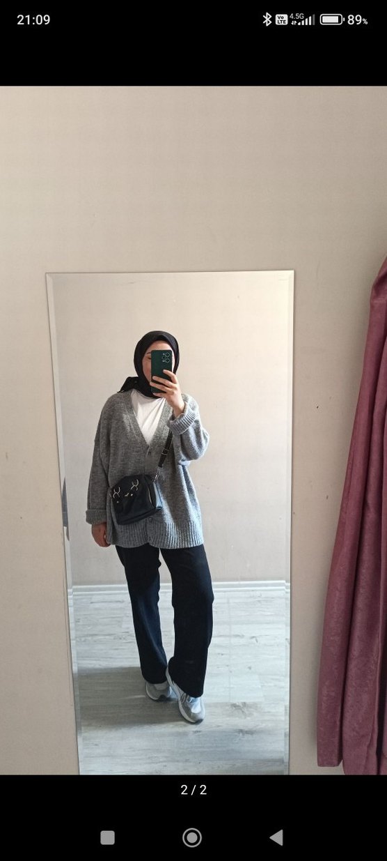 Gri renkli, salaş kesim midi boy kadın hırka, uzun kollu ve boğazlı yakalıdır. Yumuşak denim kumaştan üretilmiş, günlük kullanım için rahat ve şık bir sokak stili sunar.