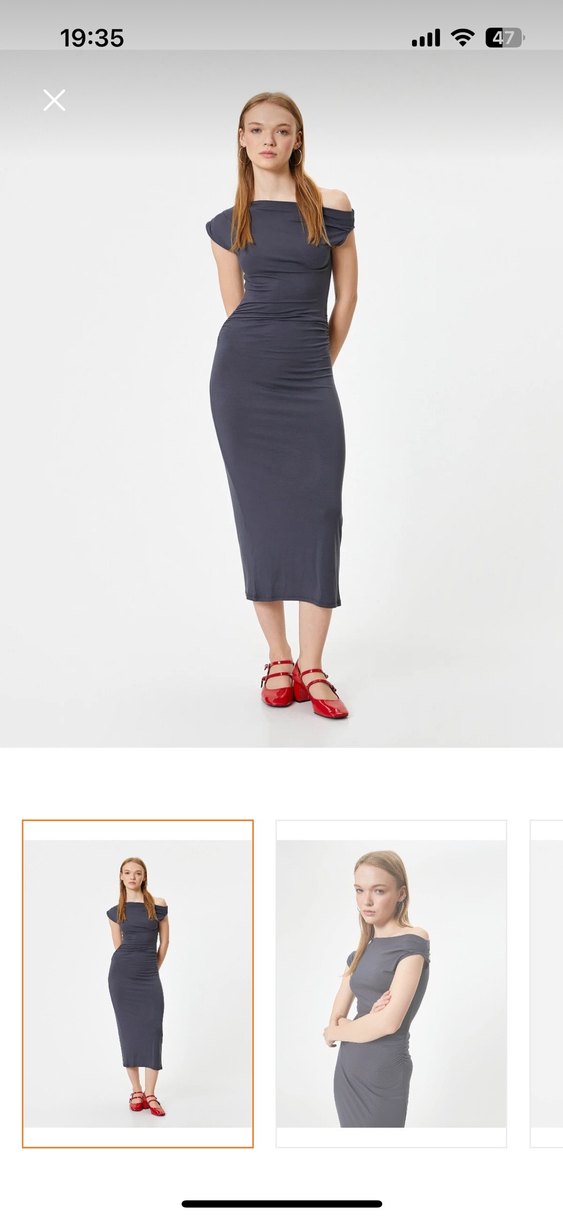 Fitted kesim, gri denim elbise, kayık yaka ve askılı kol detaylarıyla minimalist ve zahmetsiz şıklık sunar. Midi boyu ve desensiz tasarımı romantik akşamlar için uygundur.