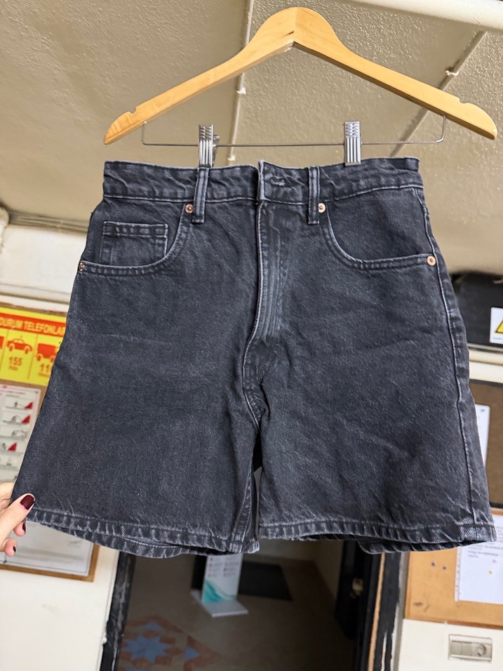Gri renkte, bol kesim ve midi boyda denim şort. Günlük kullanıma uygun, rahat ve şık bir sokak stili parçası.