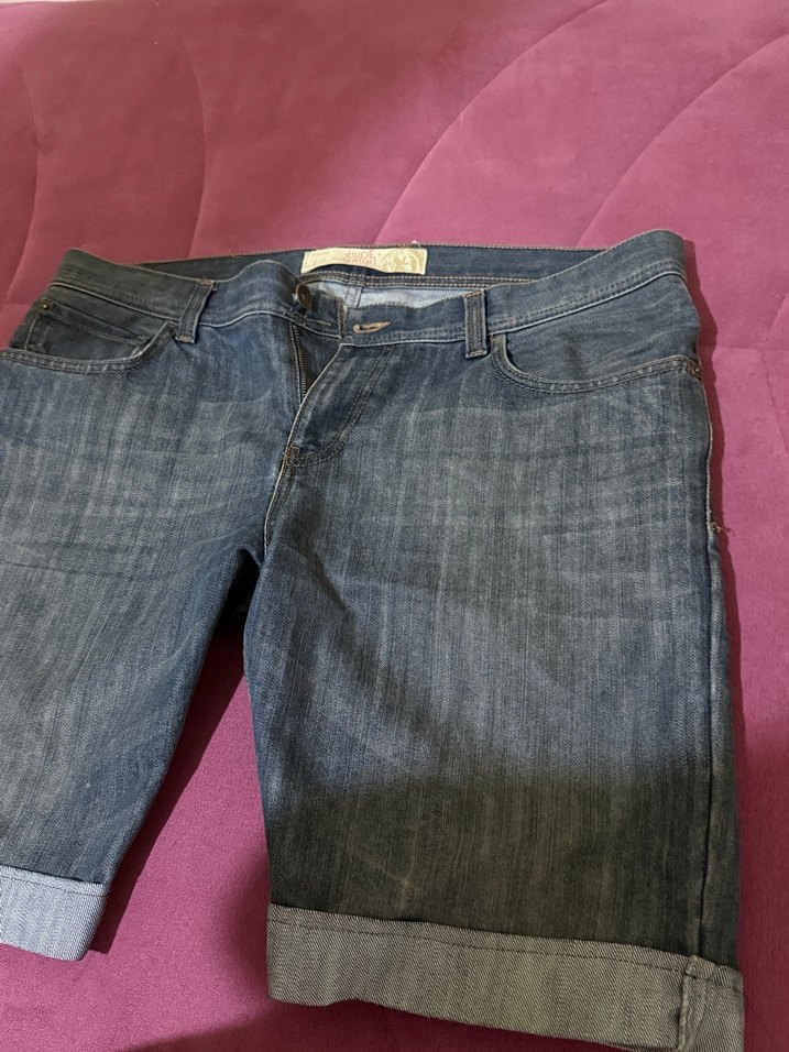 Mavi renkli, tokalı detaylı, vücuda oturan midi uzunlukta erkek denim şort. Günlük kullanım için rahat, desen içermeyen sokak stili şort.