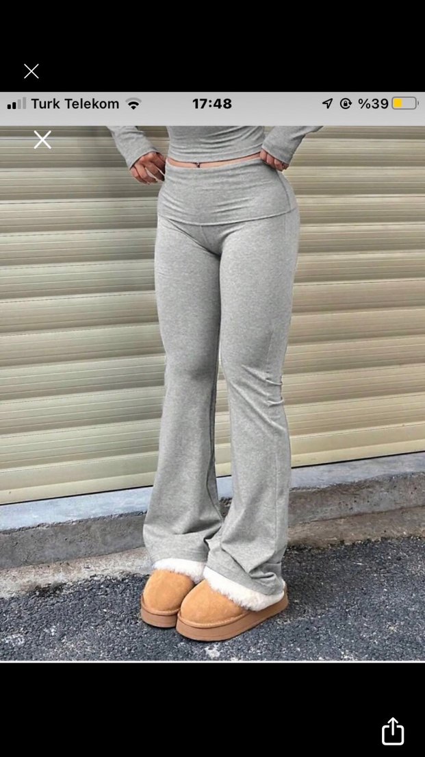 Gri, hafif sıcak tutan kumaştan yapılmış, midi boyda, ispanyol paça ve vücuda oturan pantolon, günlük kullanım için rahat ve şık görünüme sahiptir.