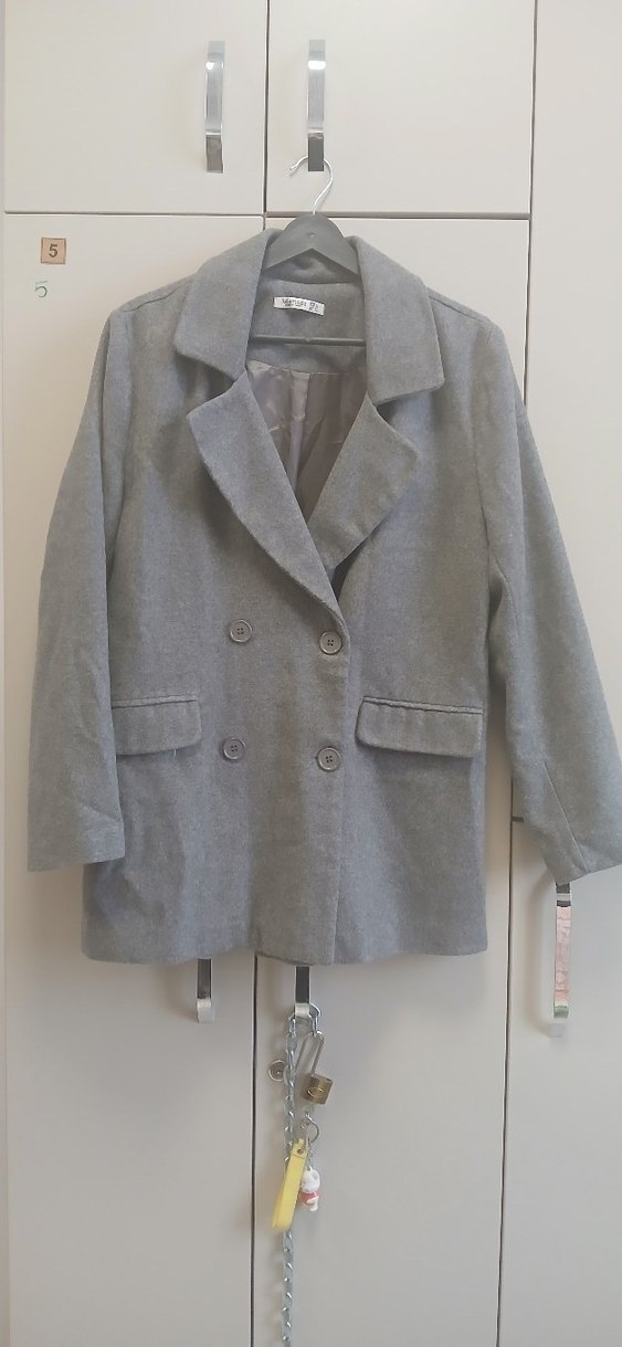 Gri renkte, ,normal uzunlukta ve düğmeli kadın kaban ceket. Notlu yaka ve uzun kolludur, ofis için uygundur.