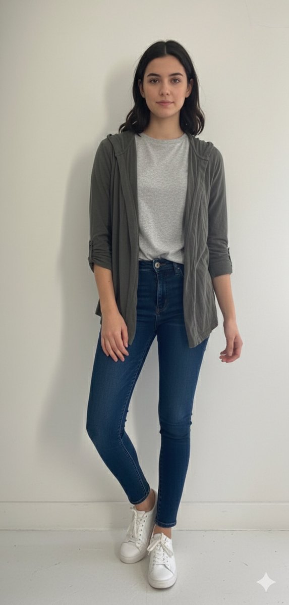 Gri renkli, keten kumaştan, uzun kollu ve drapeli tasarıma sahip salaş kadın midi hırka. Minimalist ve günlük rahat kullanıma uygun.çift taraflı