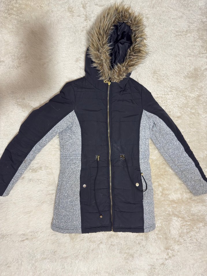 Gri ve siyahın birleşimi olan, kapüşonlu ve kürklü detaylı, uzun kollu, normal boyda, dar kesim kadın kışlık cekettir. Günlük kullanıma uygundur. Bağlama kısmındaki ufak karedeki deriler soyuldu başka sorunu yok.