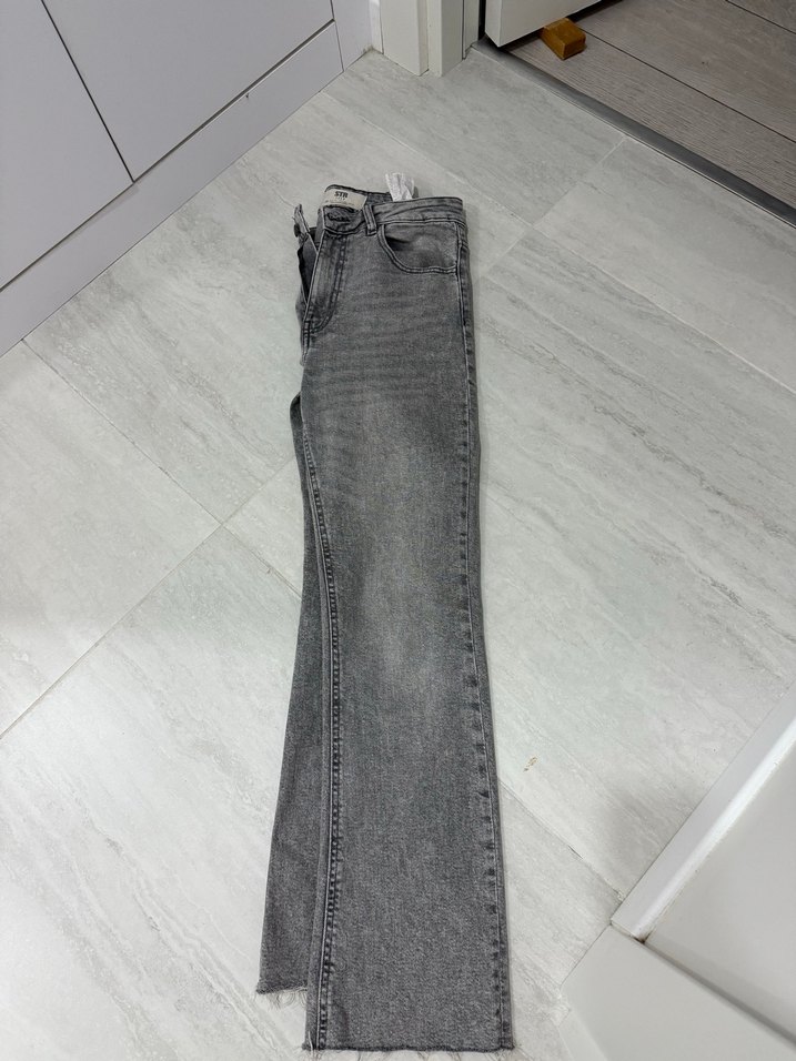 Gri renkte, normal boy midi kot pantolon. Regular fit kesim ve kemer detaylı, günlük kullanıma uygun. ✨