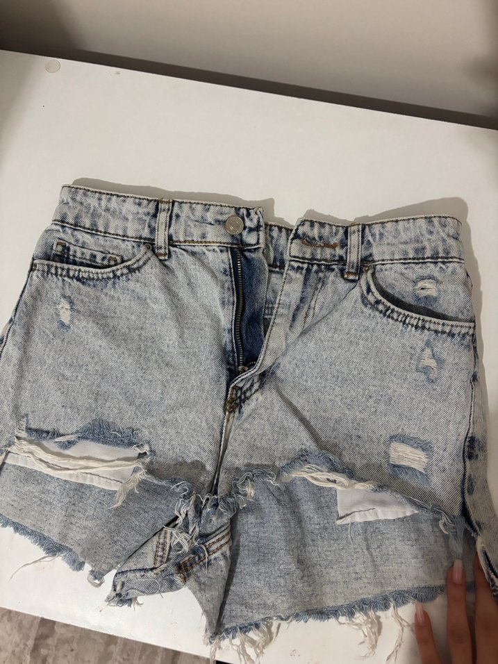 Gri kot şort, bol kesim ve tokalı detaylı, yırtık tasarıma sahip, normal midi boyda, günlük sokak stili için uygun.