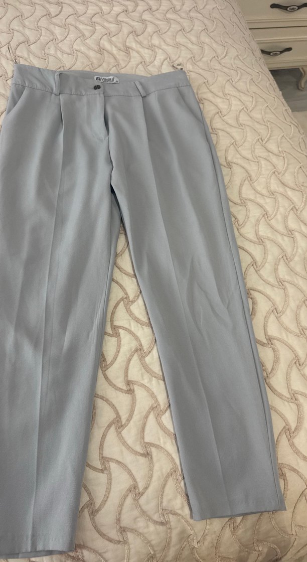 Gri renkte, normal boyda ve pilili detaylara sahip kumaş pantolon. Sentetik kumaştan üretilmiş, ofis için uygun normcore tarzda.