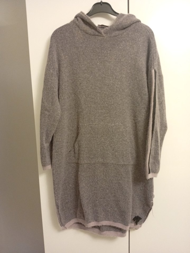 Gri renk, uzun kollu, bisiklet yaka, yumuşak yün örgüden yapılmış bol kesim kadın midi kazak. Rahat ve günlük kullanıma uygun. iki kere giydi temiz spor esnek