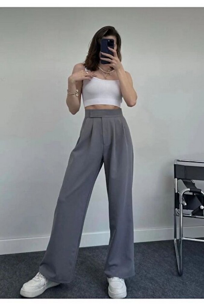 Gri Kadın Midi Pamuk Kumaş Pantolon