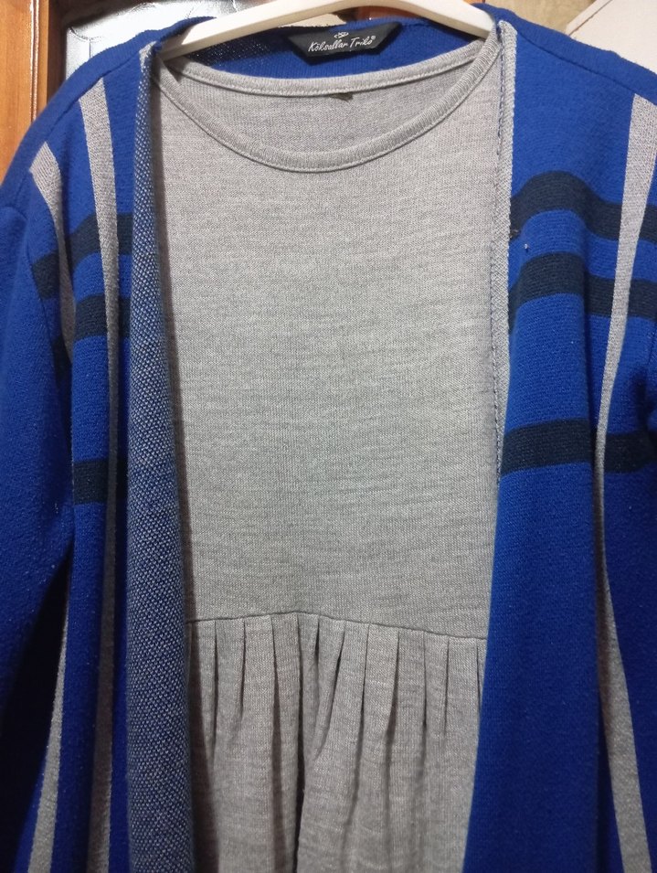 Gri Kadın Midi Yün Elbise ve mavi hırka