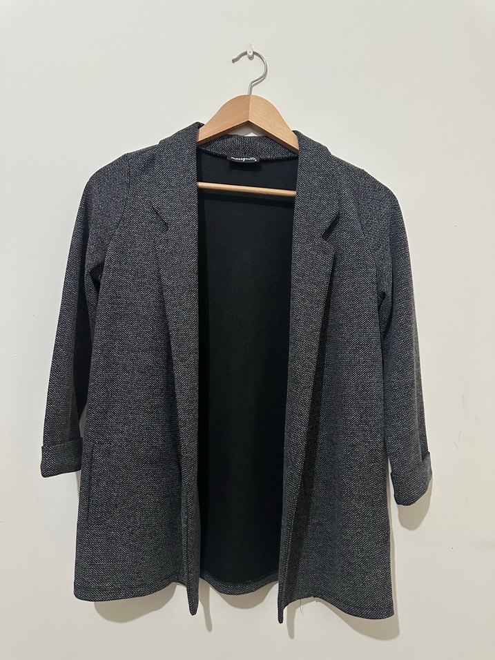 Gri renkli, yün kumaştan kadın kaban. Düğmeli, normal kesim ve uzun kollu, midi boyda, ofis stiline uygun.