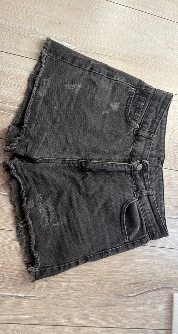Gevşek kesim, kısa, gri denim şort. Hafif yıpranmış detaylar ve tüylenmiş etek uçlarıyla günlük sokak stili için uygun.