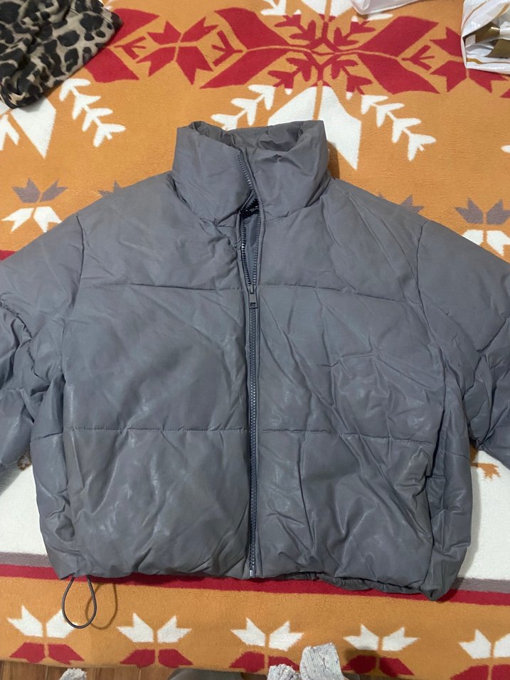 Gri renkli, yüksek yakalı, uzun kollu ve fermuarlı, kadın mont. Sokak stiline uygun, vücuda oturan kesime sahip.