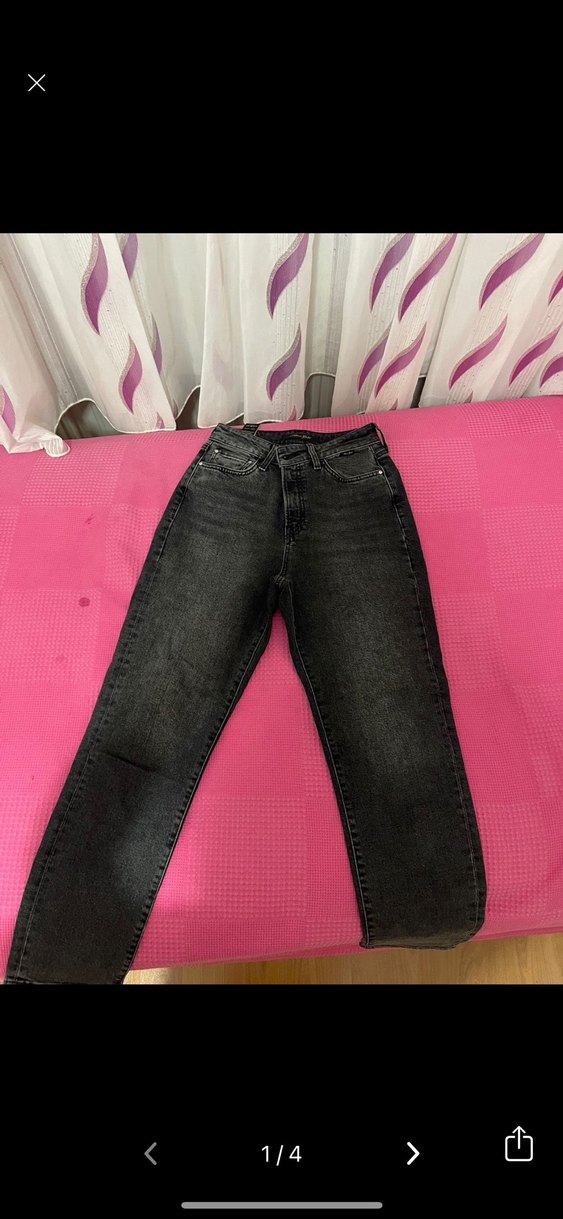 Gri renkte, dar kesim ve normal boy kot pantolon. Tokalı detayıyla günlük kullanıma uygundur. Mom jean