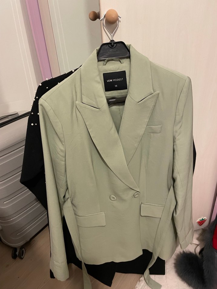 Gri, düğmeli, normal boyda kadın blazer. Notch yaka ve uzun kollu, sentetik kumaştan, ofis için uygun. Hiç giymedim