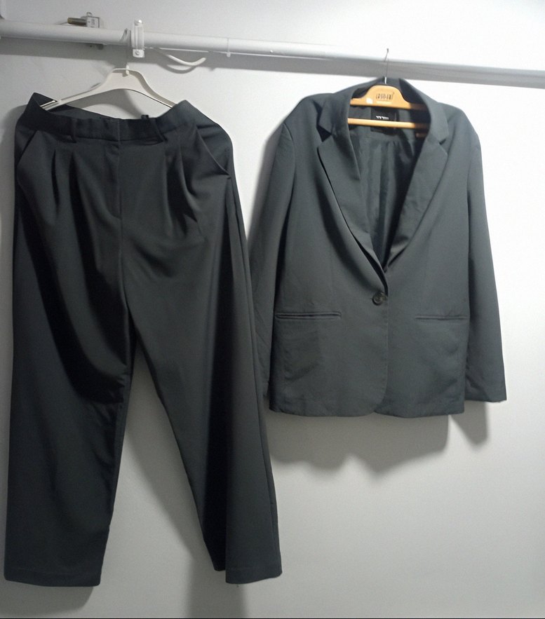 Gri kadın ceket, gri kumaş pantolon ile takım.