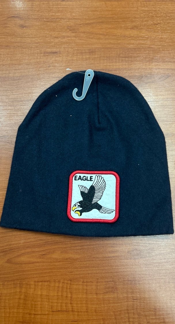 Yumuşak dokulu koyu gri örgü kadın bere, üzerinde nakışlı kartal figürü bulunur. Rahat ve sokak stiliyle uyumlu.