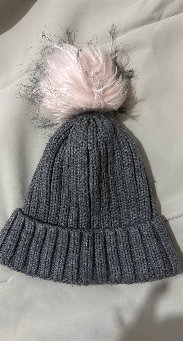 Gri örgü bere, üstünde yumuşak peluş ponpon detayıyla sıcak ve sade bir tarz sunar. Soğuk havalar için uygun.