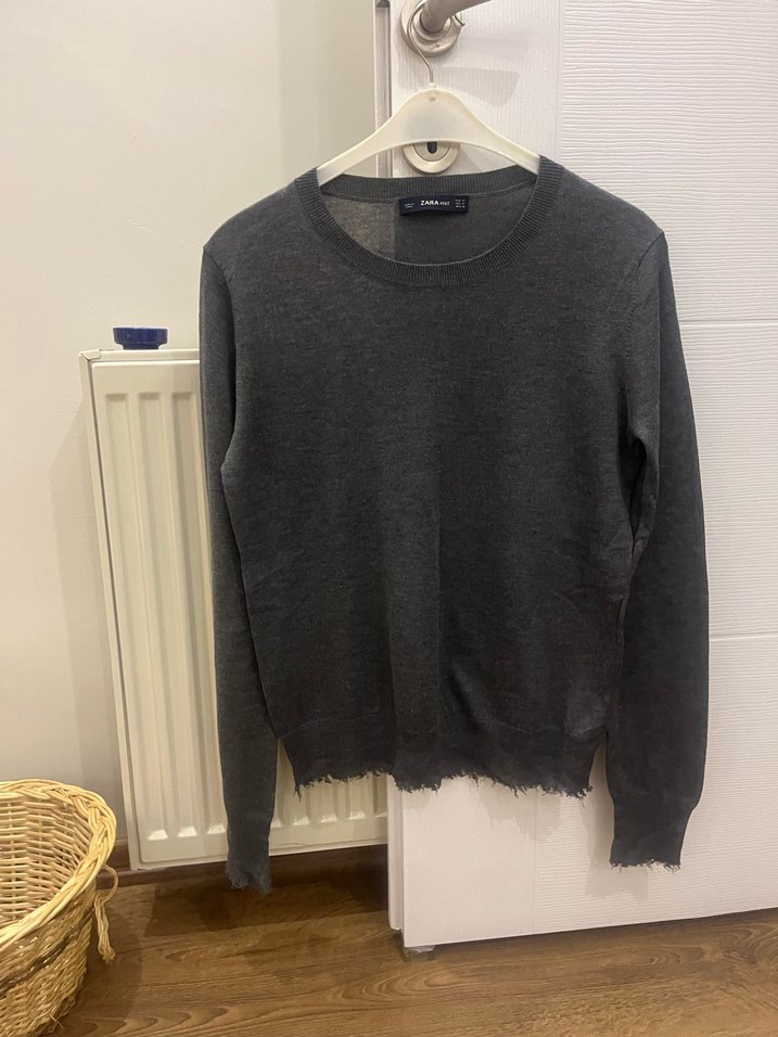 Gri renkli, uzun kollu, bisiklet yaka, bol kesim örgü keten triko kazak. Günlük kullanıma uygun rahat sokak stili.