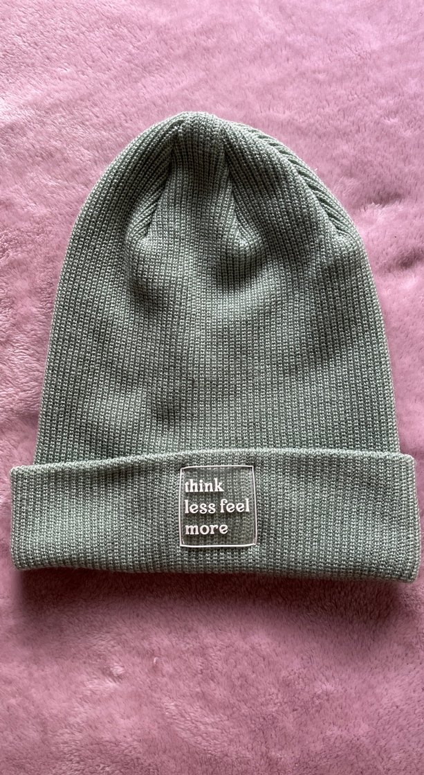 Gri örgü yün bere, katlanabilir manşet üzerinde "think less feel more" yazılı bir etikete sahiptir. Sade ve rahat bir stil sunar.