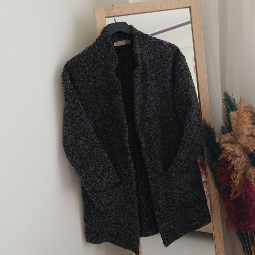 Gri renkli, örgü yün hırka, kesik yakalı ve uzun kolludur. Rahat kesimi ve midi boyu ile günlük kullanıma uygundur.