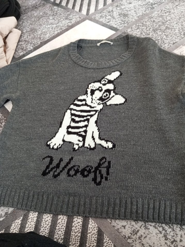 Gri renkli yün kazak, yuvarlak yaka ve uzun kolludur. Rahat kesimiyle örgü köpek figürü ve "Woof!" yazısı işlemelidir. Rahat ve gündelik tarzda.onunde leke vardir