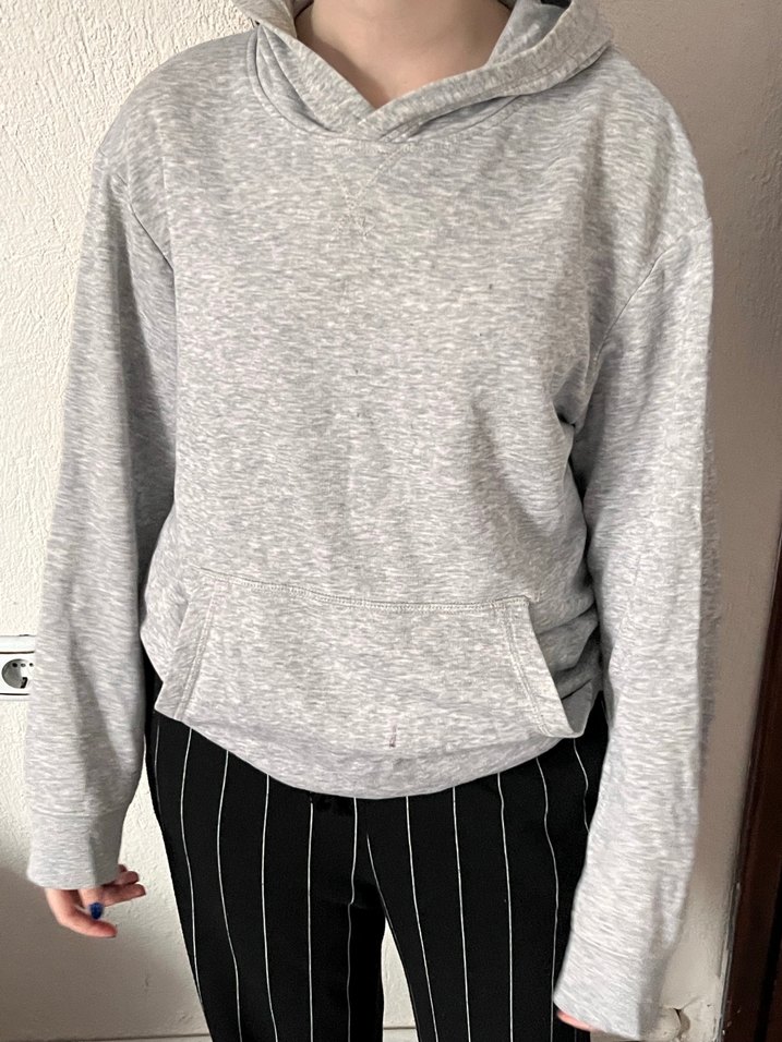 Gri kadın sweatshirt, uzun kollu ve yuvarlak yakalıdır. Yumuşak keten kumaştan, rahat ve oversize kesimlidir. H&M S-M beden uyumludur