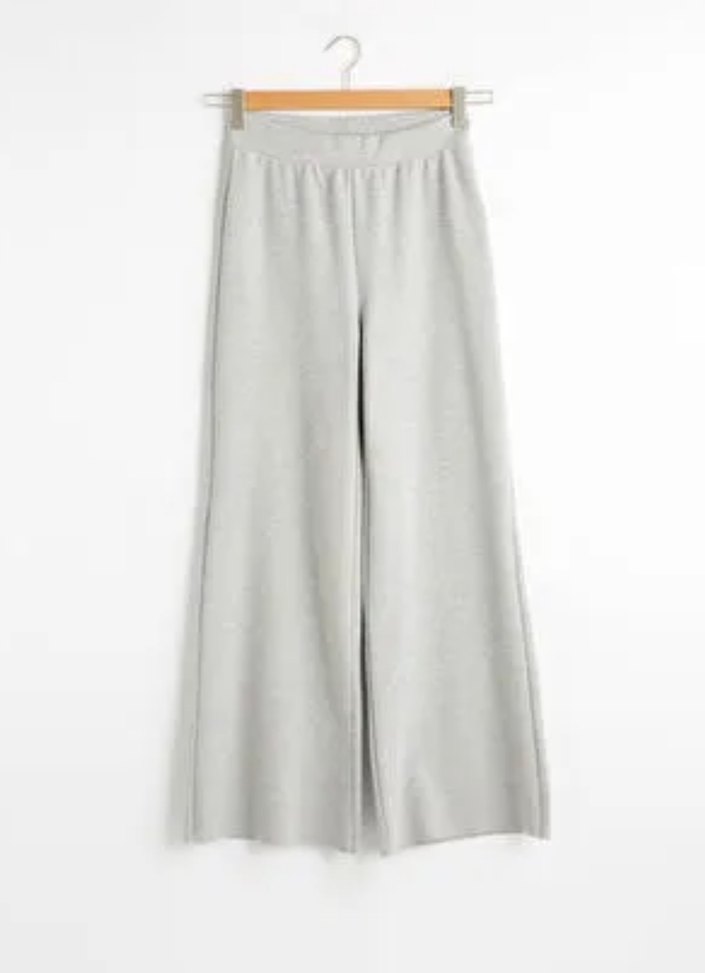 Gri pamuklu, rahat kesim ve midi boy pantolon. Günlük kullanım için sade ve desensiz, şık ve konforlu bir tercih.